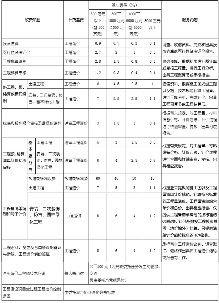 4、計費基數是總投資扣除土地費用及政府規費,工程建設其他費用(如設計費、監理費、咨詢費等二類費用)可以按20%的折扣計取。